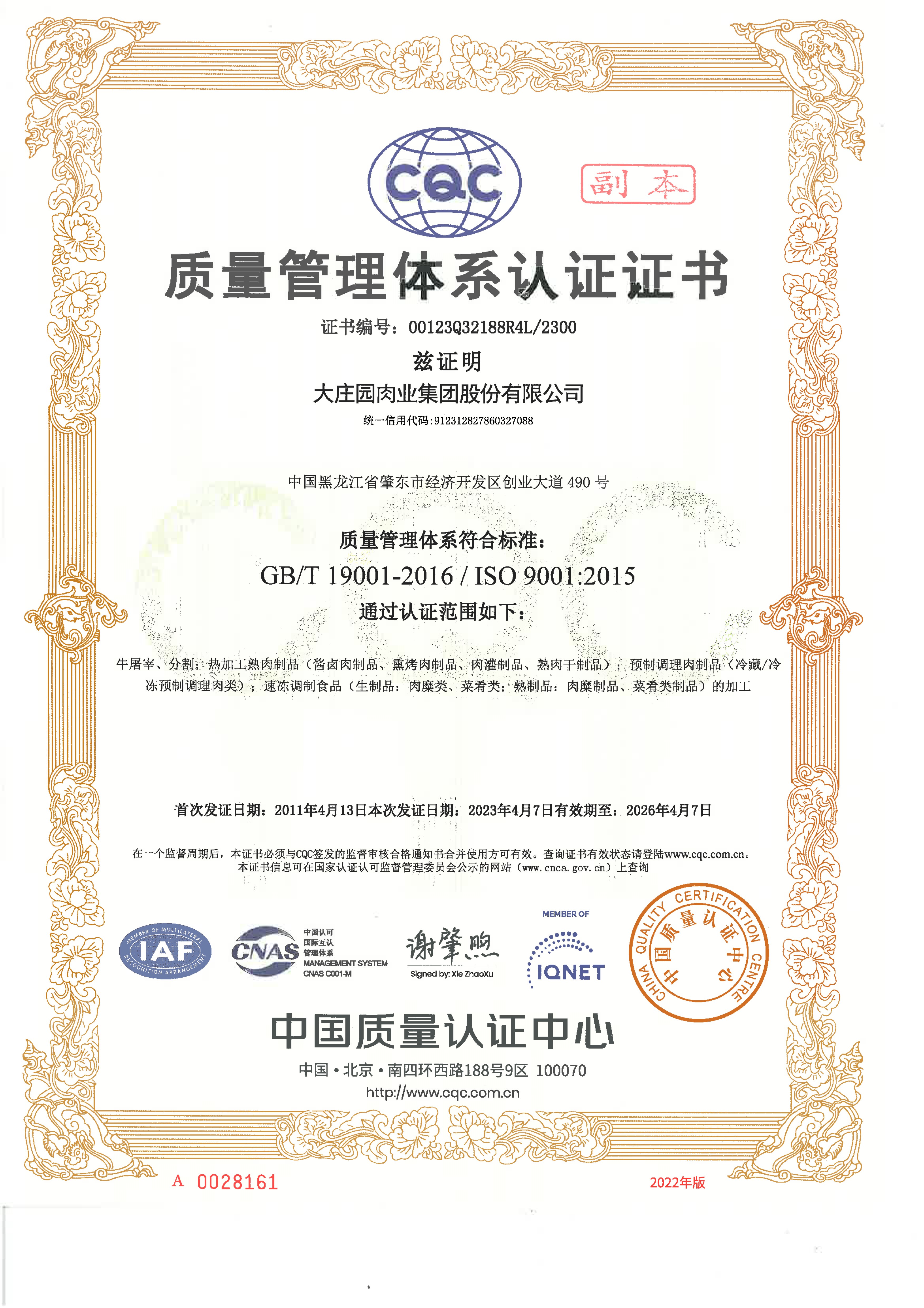 食品安全管理體系認(rèn)證證書(ISO22000)中文